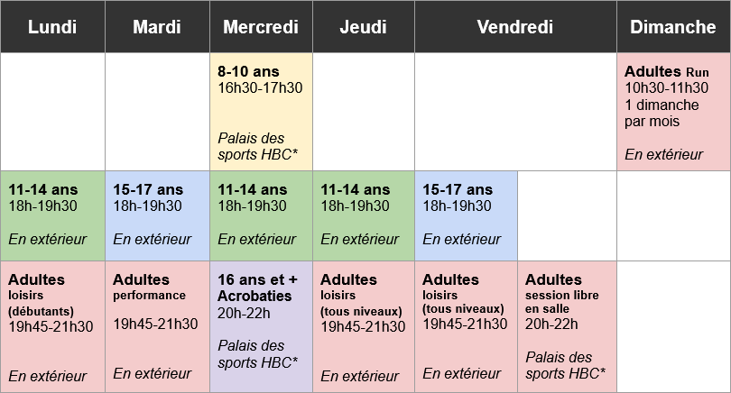 | Vendredi loisir (tous niveaux) | Acrobaties (mercredi) + Run mensuel (dimanche) |